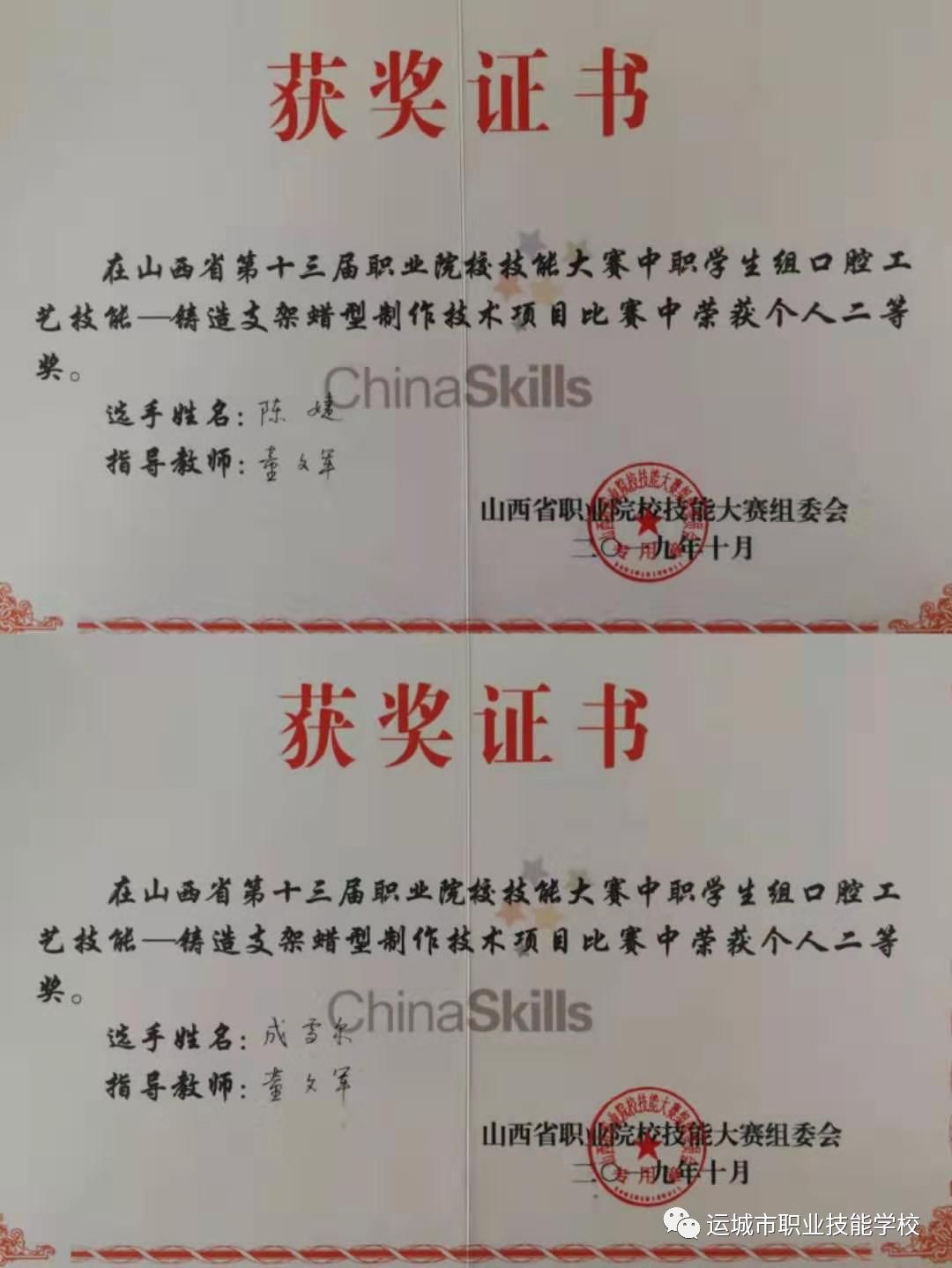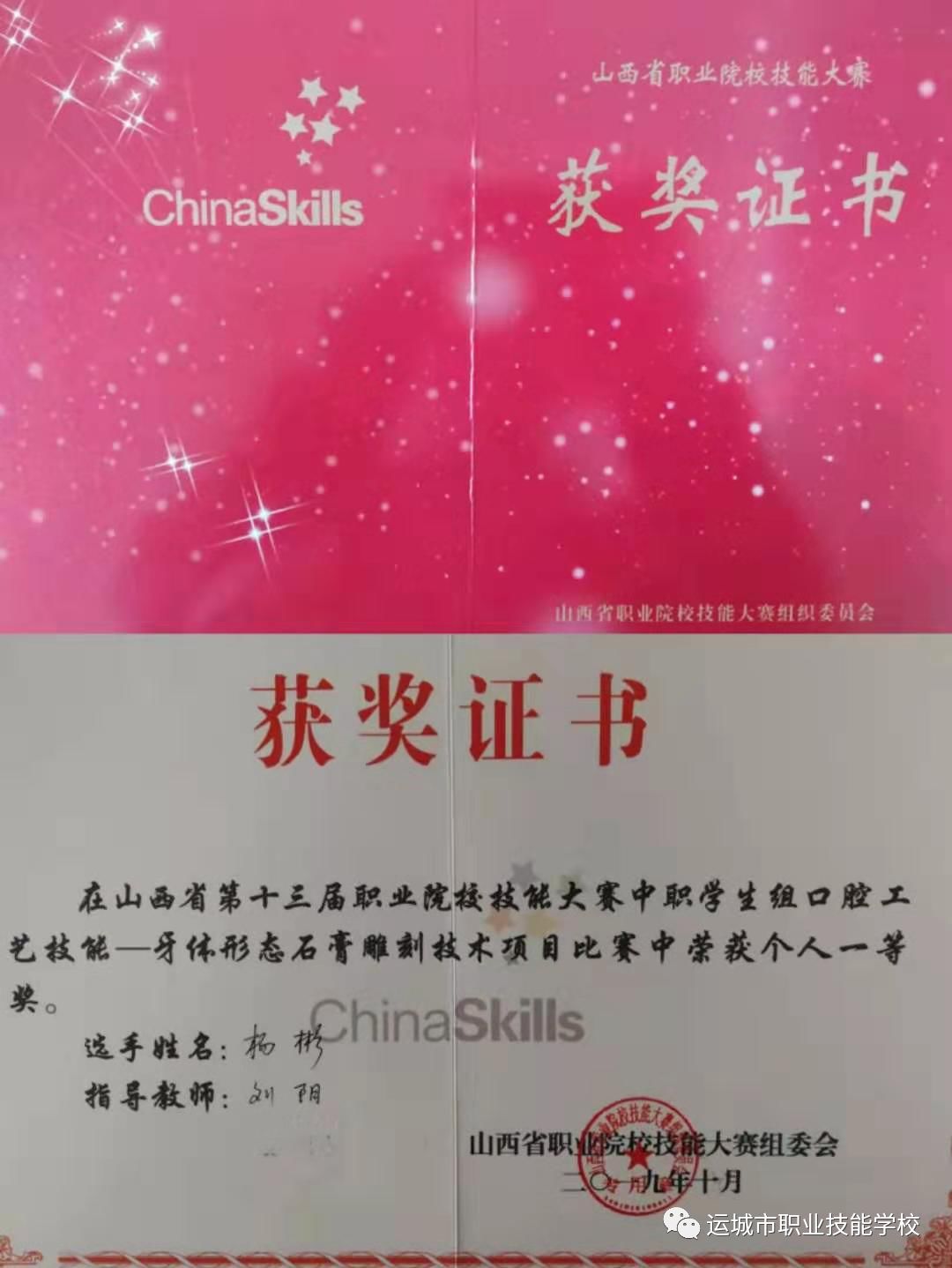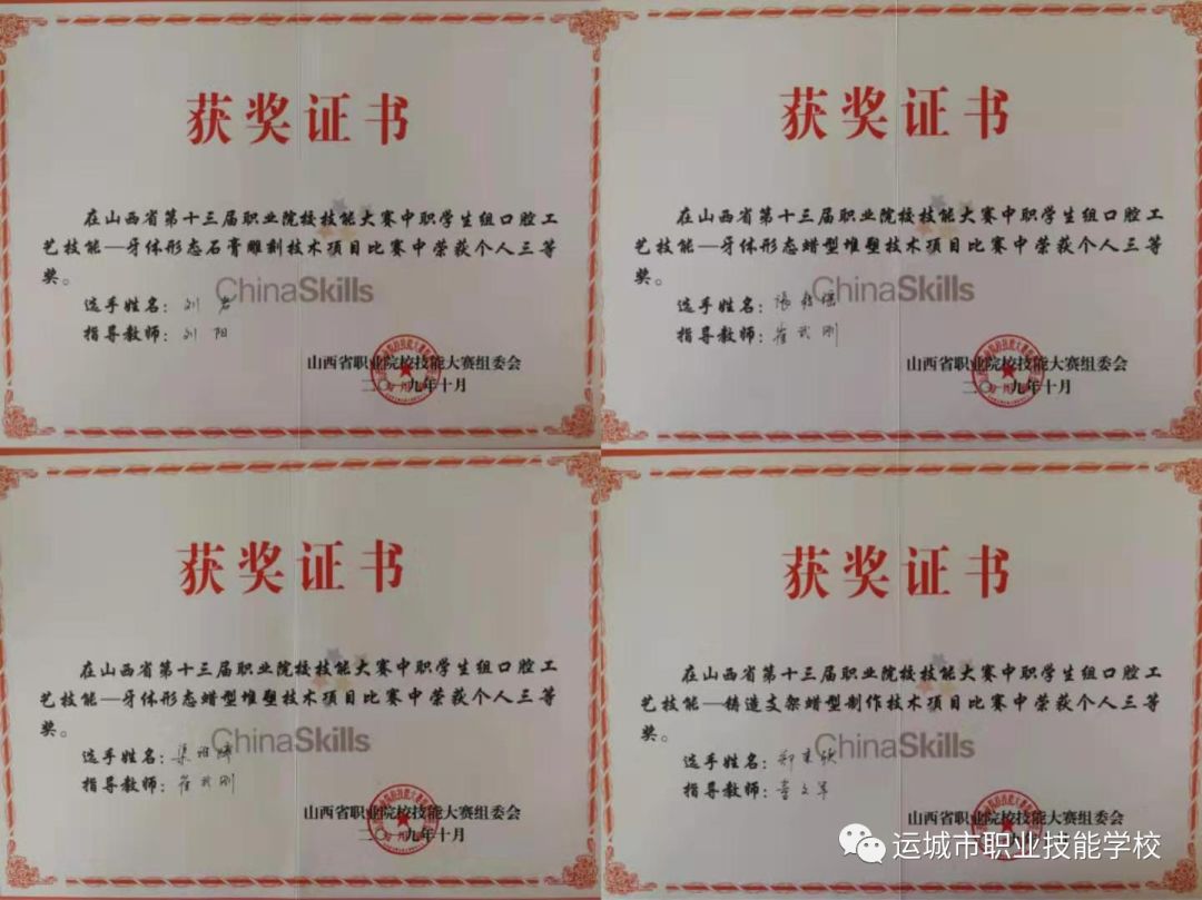 在刚刚结束的山西省第十三届职业院校技能大赛中,来自全省各地的十一所院校代表队精英展开激烈角逐,我校口腔专业代表队首次组队参赛便创造佳绩,15人参赛13人获奖,其中杨彬同学荣获牙体形态石膏雕刻技术项目一等奖,陈婕、成雪尔同学荣获铸造支架蜡型制作技术项目二等奖,毕佳瑶、翟梦瑶、张毅瑶、渠雅婷、刘晓庆同学荣获牙体形态蜡型堆塑技术项目三等奖,刘岩、江景宜同学荣获牙体形态石膏雕刻技术项目三等奖,郑秉欣、裴瑞泽、索思虞同学荣获铸造支架蜡型制作技术项目三等奖,刘阳、董文军、崔武刚老师荣获指导教师奖,我校学生获奖人数和获奖比例在该赛项全省所有中职院校参赛队中名列前茅,这也是我校学生在技能大赛参赛史上一次历史性的突破!