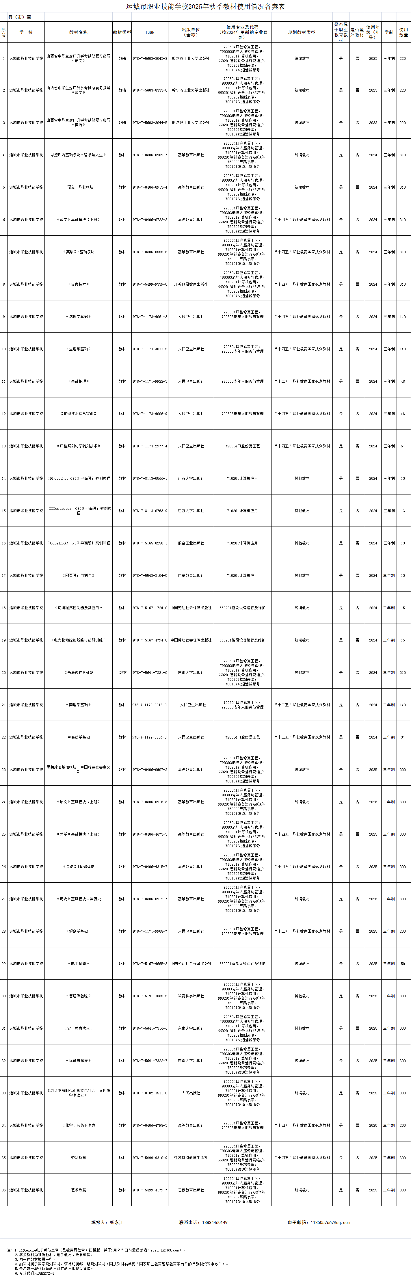 运城市职业技能学校2025年秋季教材使用情况备案表